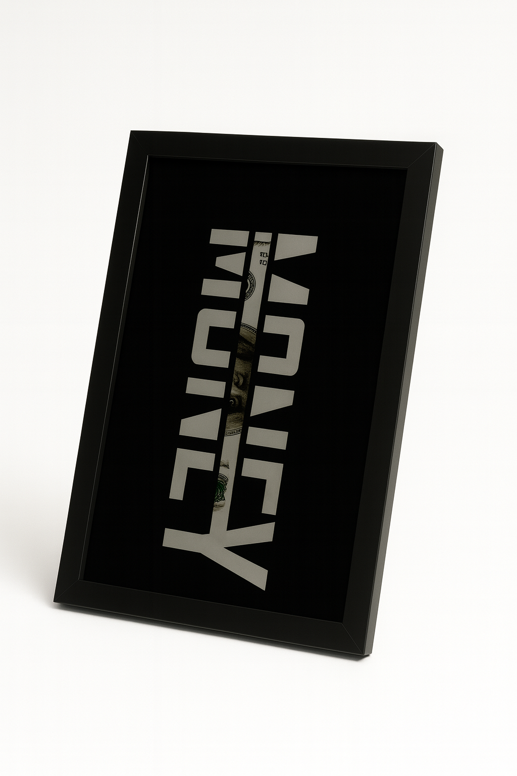 Edgy, dark-themed artwork with the word “MONEY” cut out to reveal hidden cash beneath. A modern and bold decor choice for those who believe in making money in silence.