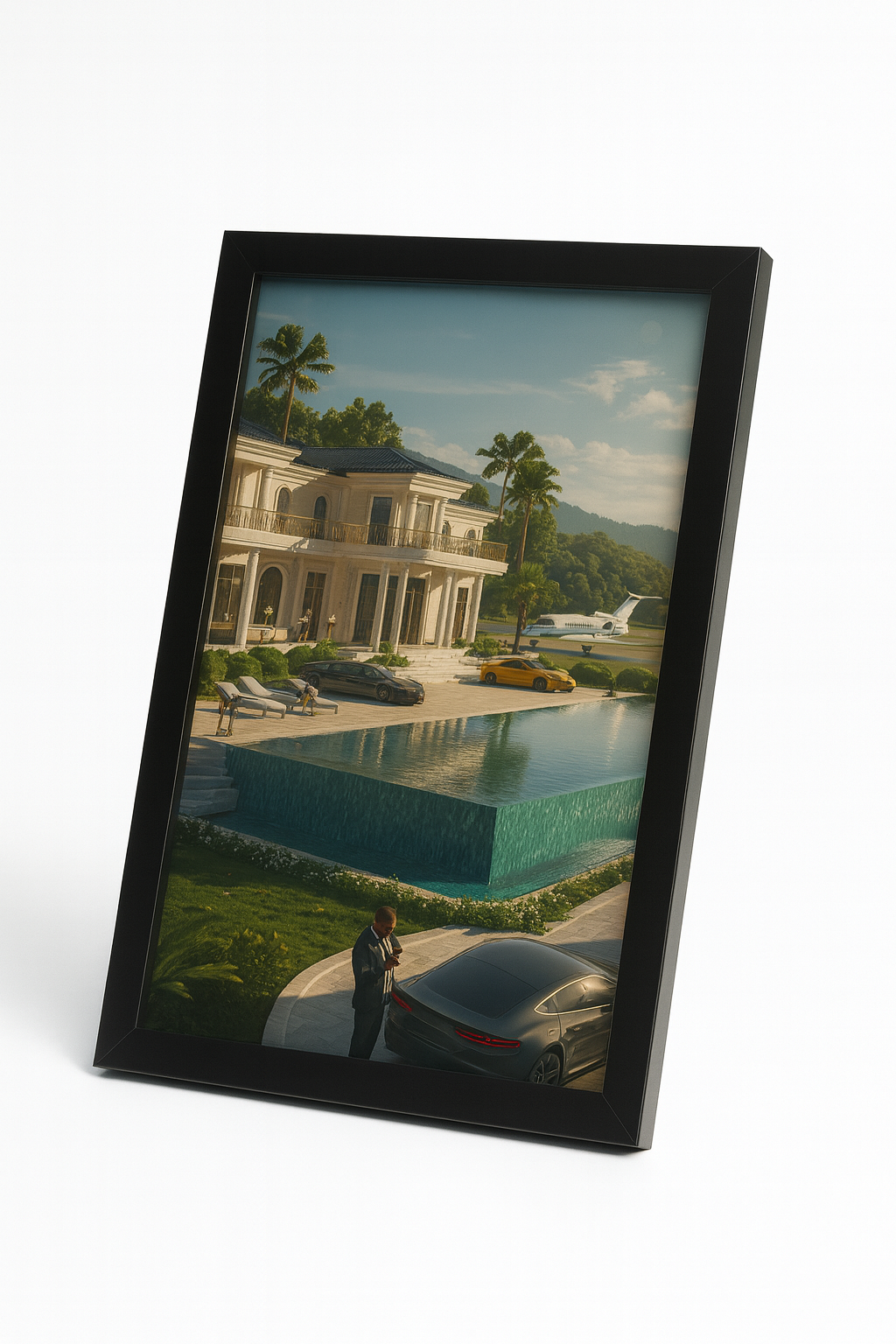 An aspirational art piece of a luxurious villa, supercars, and a private yacht — the ultimate symbol of success. Perfect for vision boards and dream-driven interiors.
