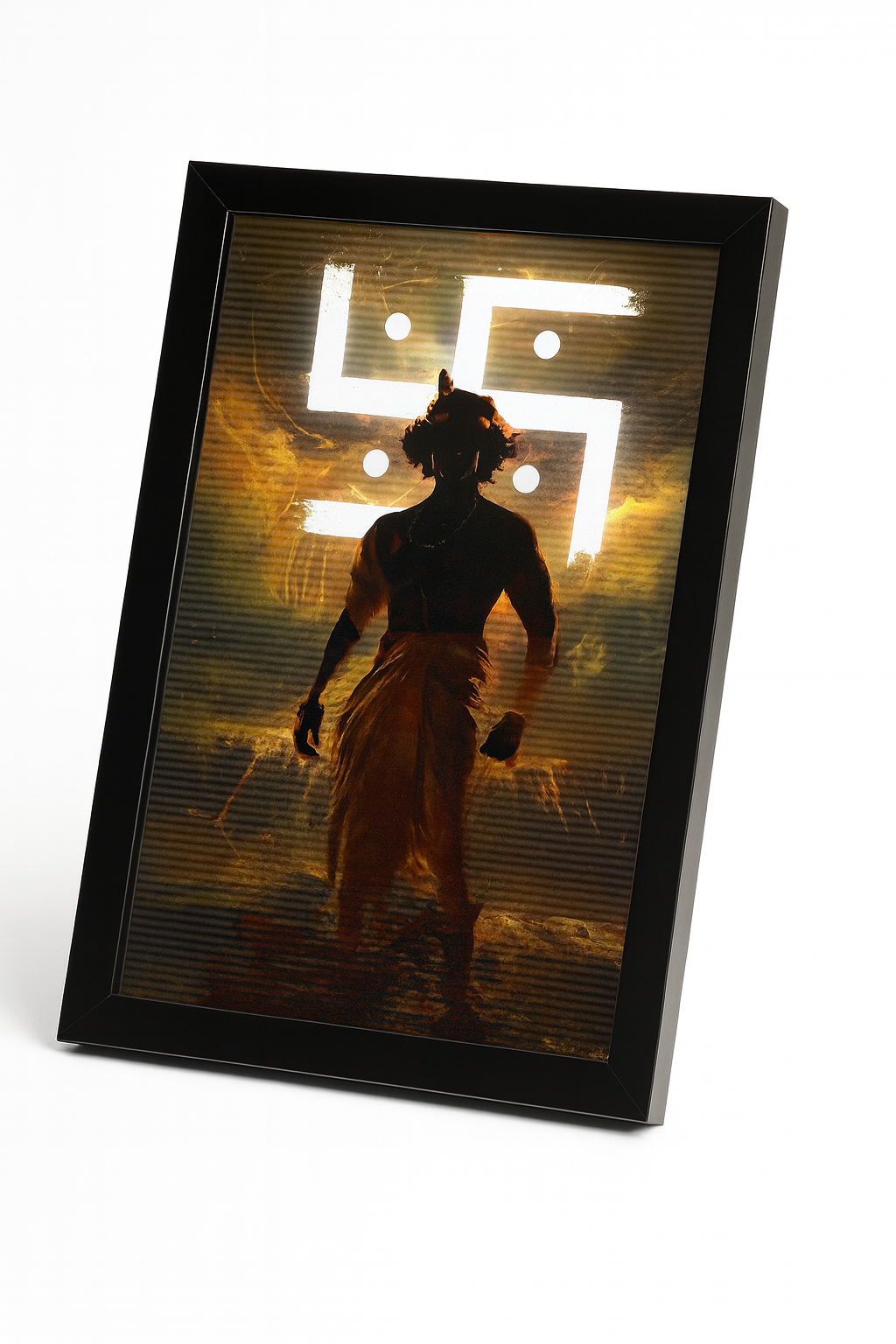 A divine silhouette of Lord Krishna against a glowing swastika backdrop, symbolizing eternal love, dharma, and victory of light over darkness.